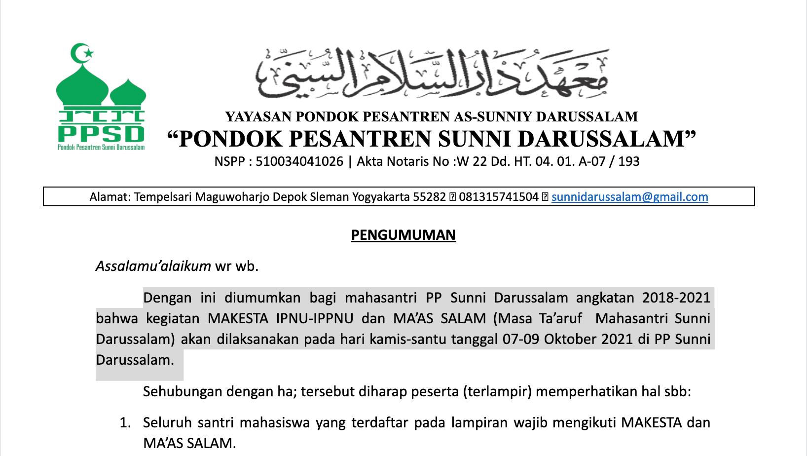 Dengan ini diumumkan bagi mahasantri PP Sunni Darussalam angkatan 2018-2021 bahwa kegiatan MAKESTA IPNU-IPPNU dan MA’AS SALAM